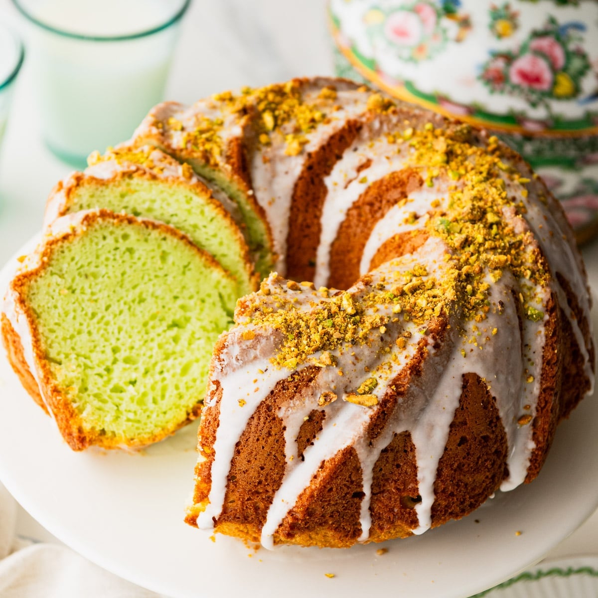 Pistachio pudding mix gives this bundt a soft, nutty flavor and the prettiest pale green color. Retro in the best way and always a conversation starter!
