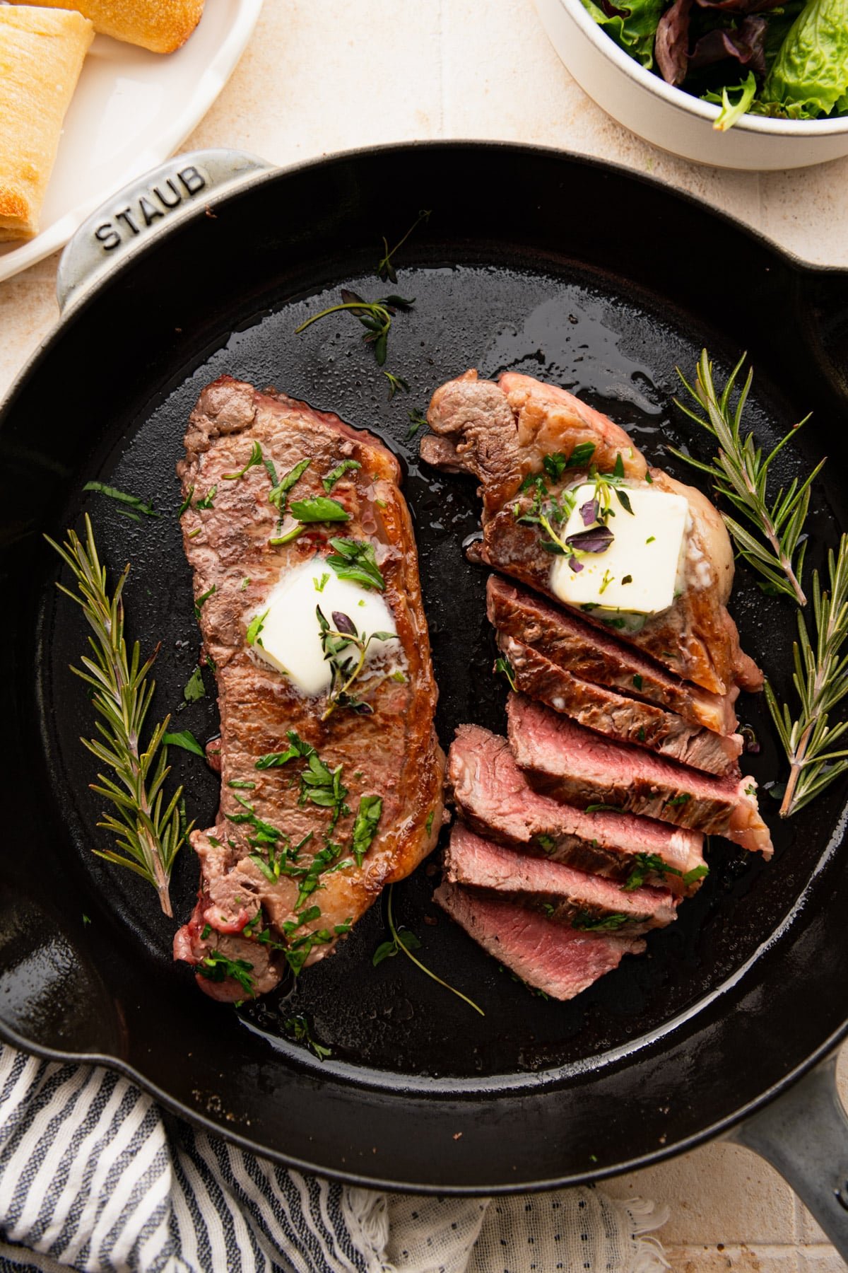 Close overhead shot of cast iron steak with butter and fresh herbs.