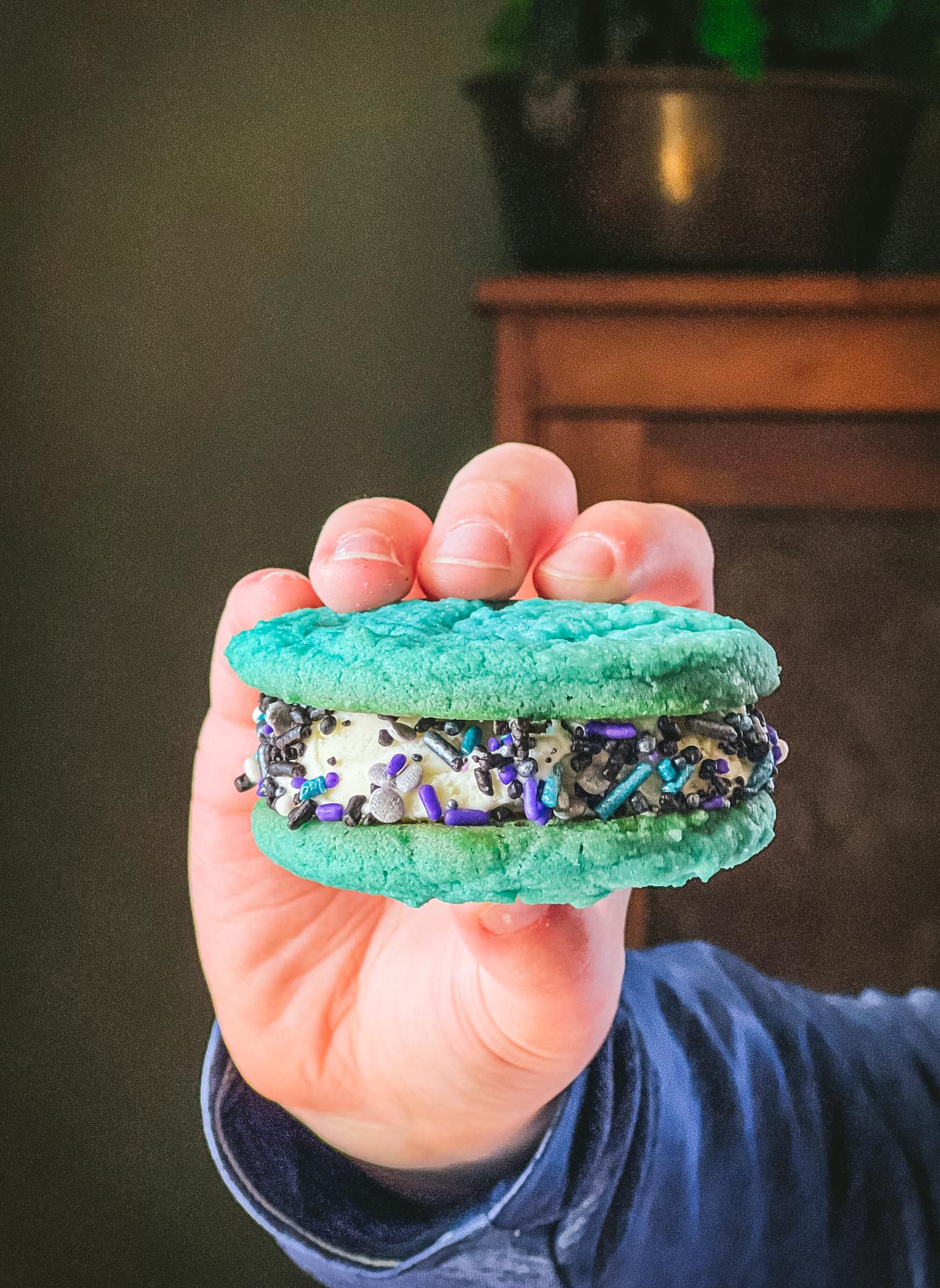 He found these blue sugar cookie ice cream sandwiches in his Star Wars cookbook, so that’s what we did! They were essentially sugar cookies with blue coloring, vanilla ice cream, and galaxy sprinkles. Not bad!