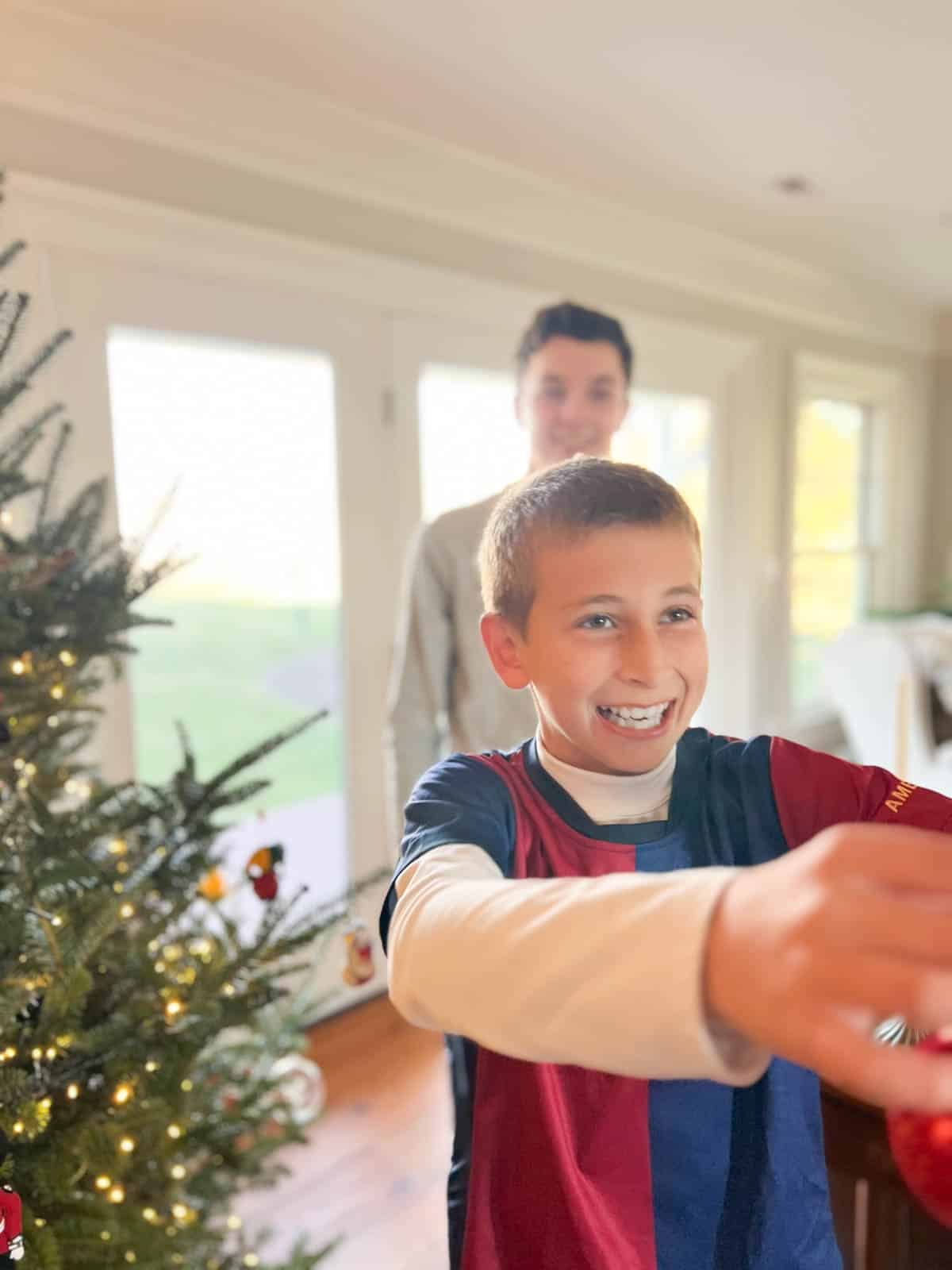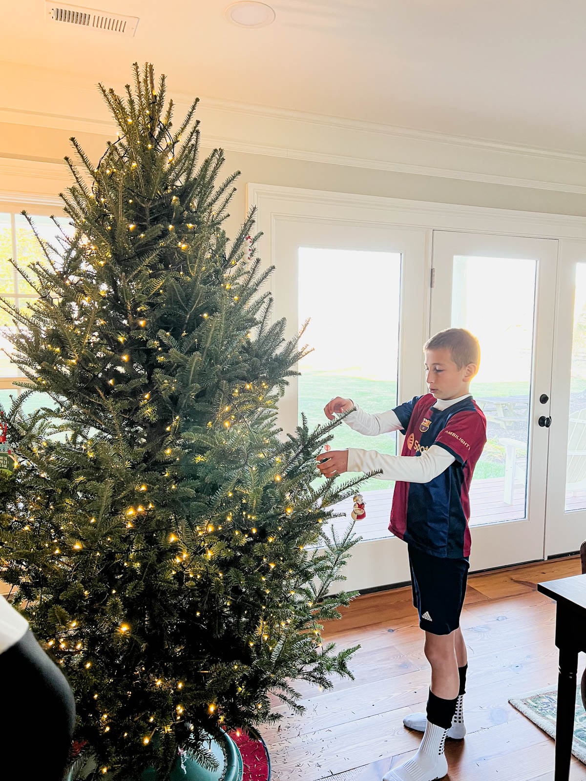 The younger boys put a couple of ornaments on the tree, and then quickly lost interest and went back outside to play. Gibbs and I finished the rest!