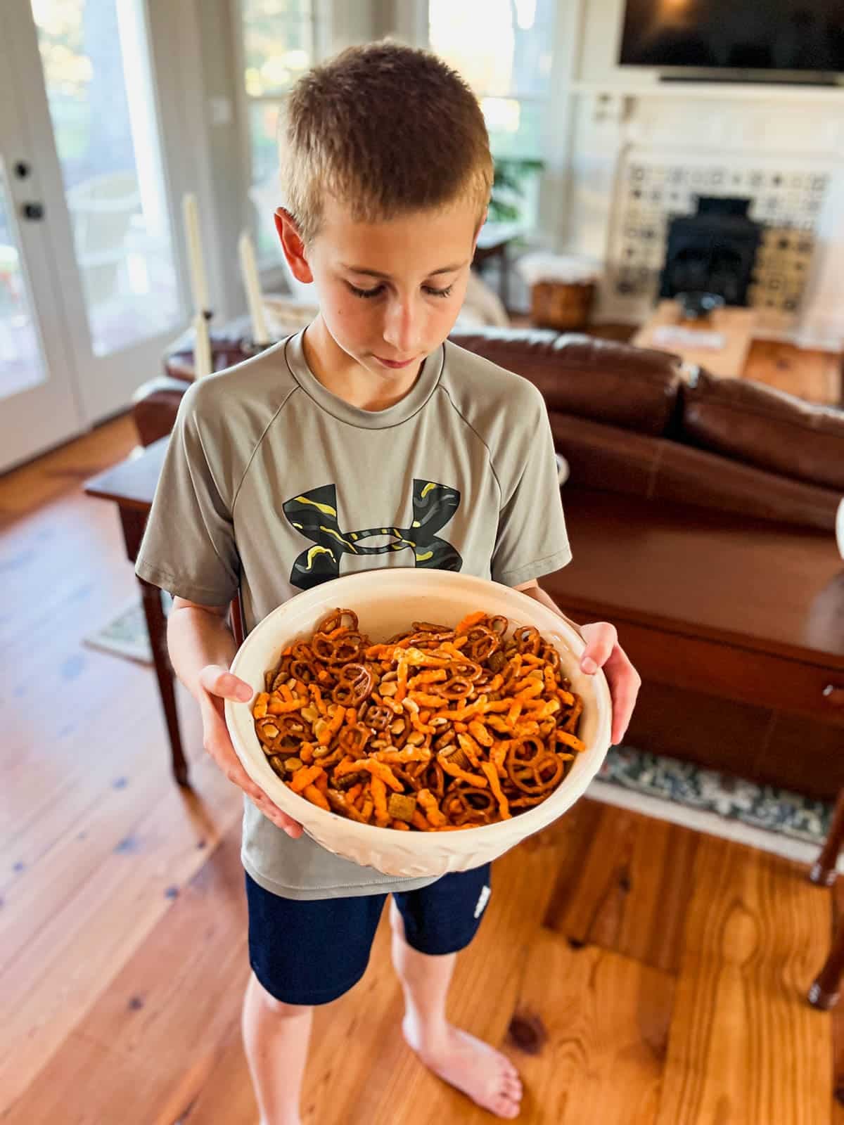 We had a week off from kids’ sports practices, which was such a nice change of pace. Spencer was excited to make this snack mix to take to his grandparents’ house for Thanksgiving. He first made it in Home Ec class the week before and really liked, so he wanted to try it again at home. It was good (and very easy)!