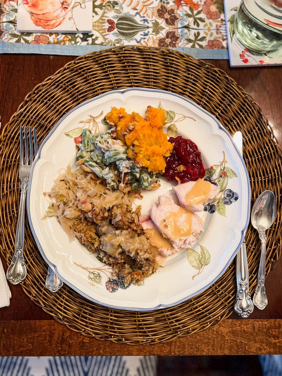 My mom made all of the classics: turkey, gravy, sausage stuffing, green bean casserole, apple and butternut squash casserole, my grandmother’s sauerkraut with bacon, and cranberry sauce.