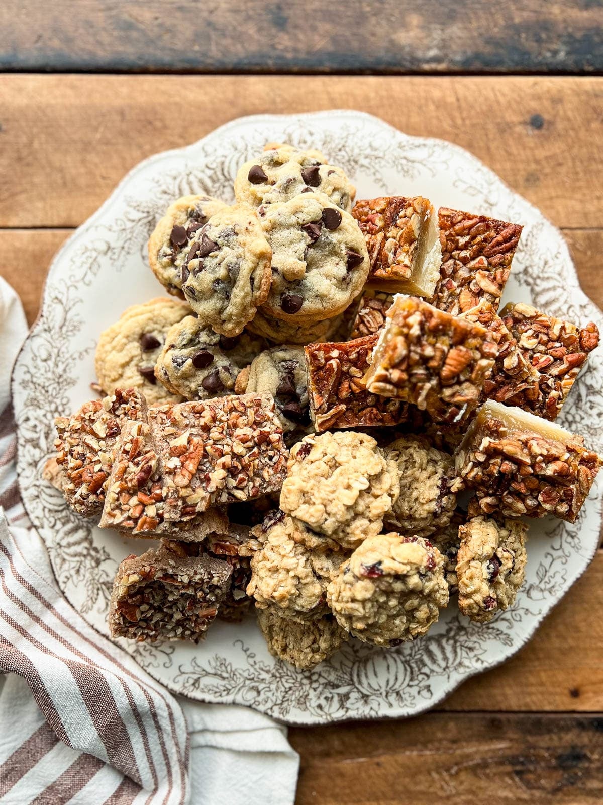 plus a dessert tray to accompany my mom’s pumpkin chiffon pie. This included Ashley’s cinnamon pecan cookie bars, chewy oatmeal cranberry cookies (recipe coming soon), chocolate chip cookies, and easy pecan pie bars.