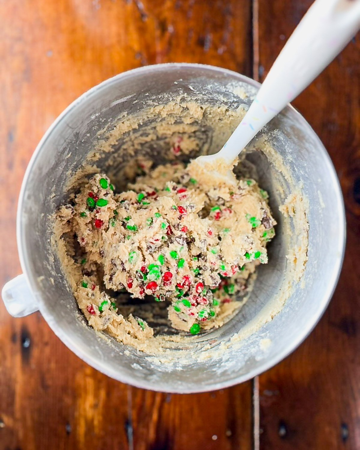 and baking a few batches of cookies. I made our favorite chocolate chip cookies (minus the flaky sea salt), but swapped the chocolate chips for mini Christmas M&M’s…