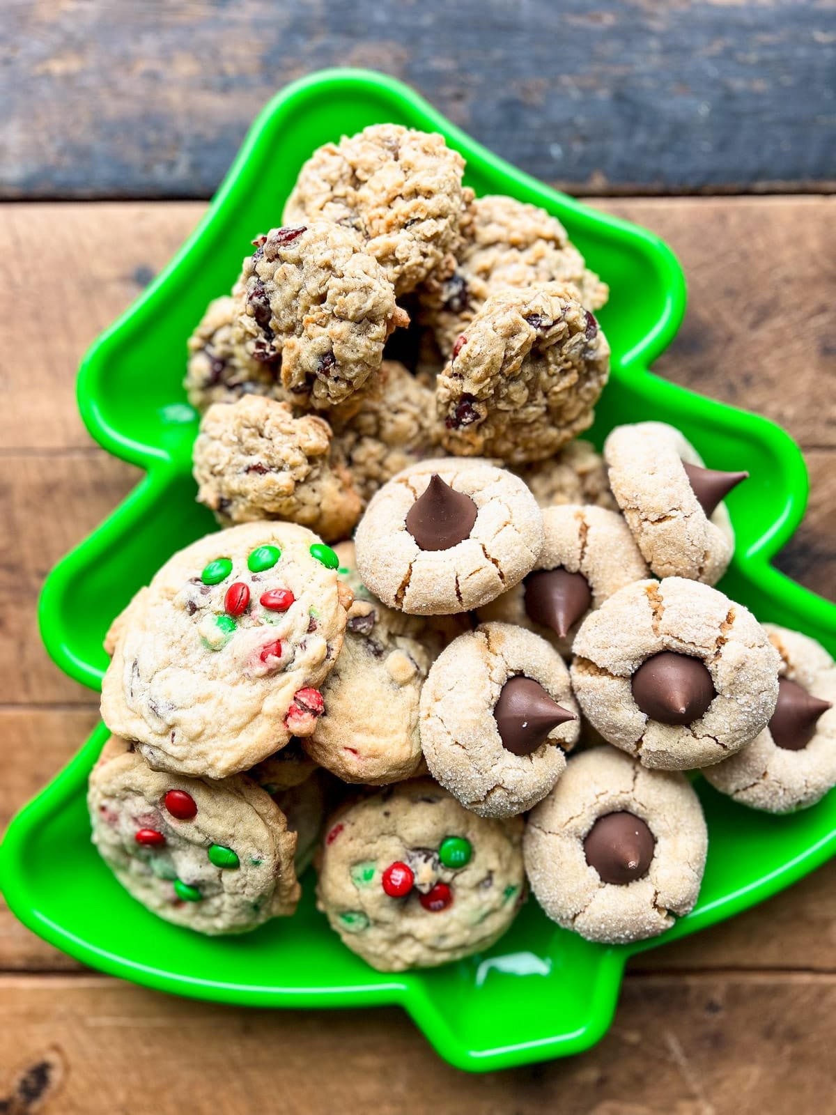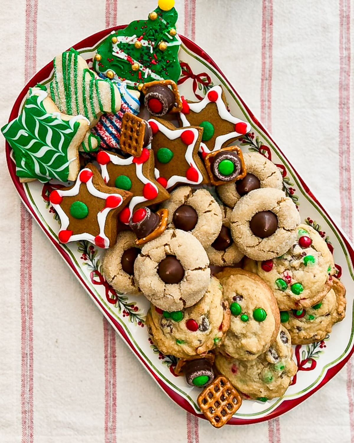 and a tray of Christmas cookies (specifically, soft peanut butter blossoms, M&M chocolate chip cookies, soft cut-out sugar cookies, and Williamsburg gingerbread).